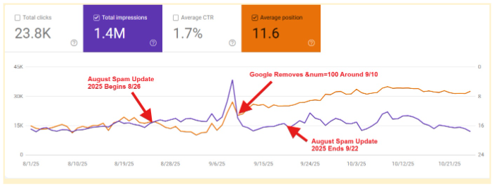 A key thing to understand is that impressions are counted when a user’s page loads, not when the user actually physically views the link on their screen. That means that, for &num=100 searches, all 100 results get an impression. With this in mind, it makes sense that the end of &num=100 has led to considerable fluctuations in core web vitals metrics, specifically impression data. Now, in order for a rank 95 link to get an impression, the user (or crawler) has to perform a total of 10 fetches, instead of just one. With fewer results per page, there are fewer impressions.